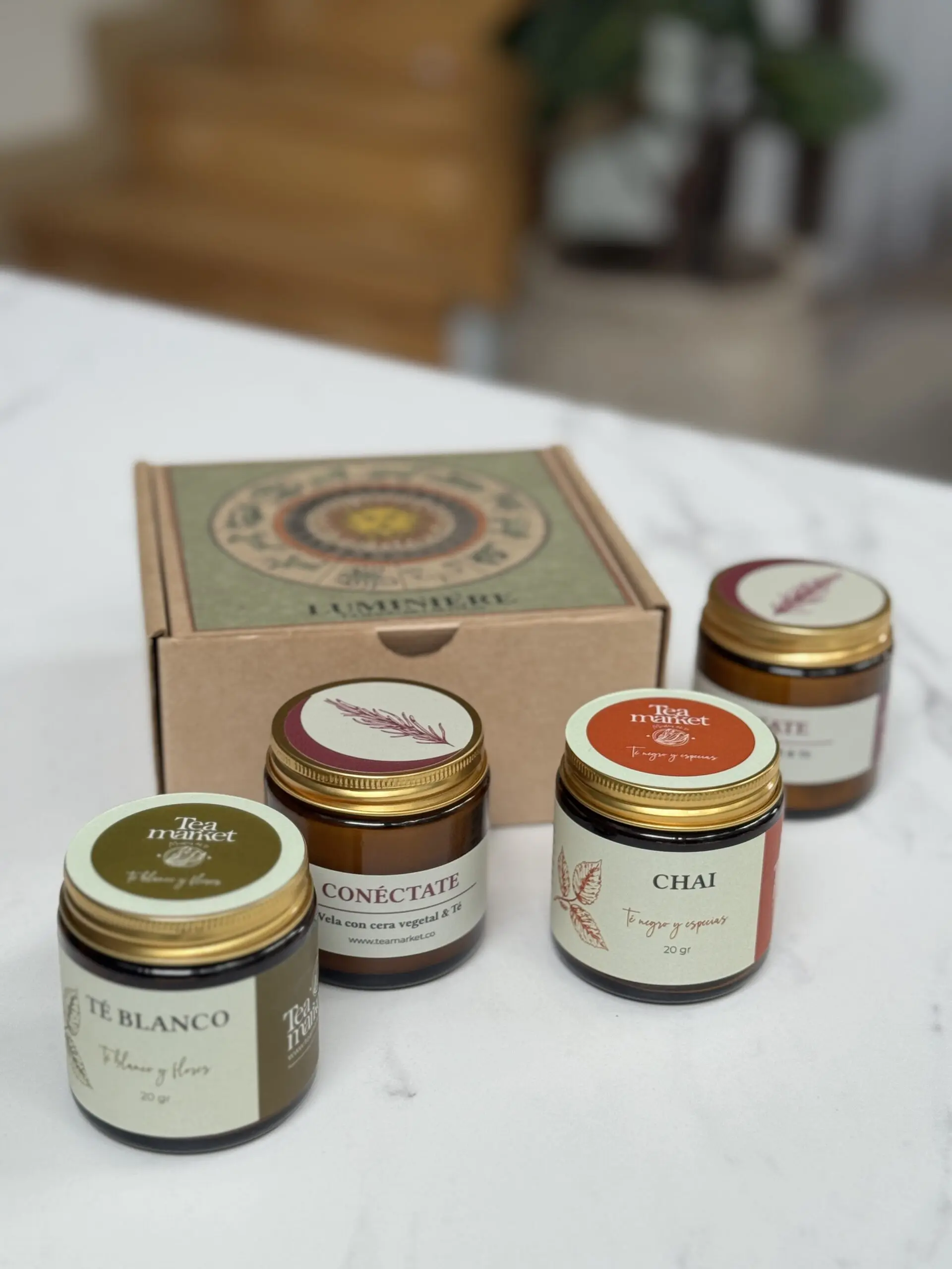 Despide el día con un instante de serenidad. Disfruta un Té Blanco floral (20g) y deja que el aroma relajante de la vela de lavanda te envuelva, ayudándote a soltar tensiones y preparar tu descanso.